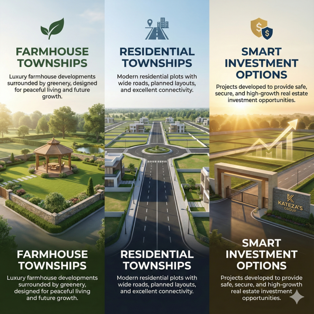 Kateza’s Group is a trusted real estate company specializing in farmhouse townships and residential townships.We focus on planned development, transparency, and long-term value, offering projects that balance nature, modern infrastructure, and secure investment opportunities. Our goal is not just to sell land, but to build trusted communities for a better future.