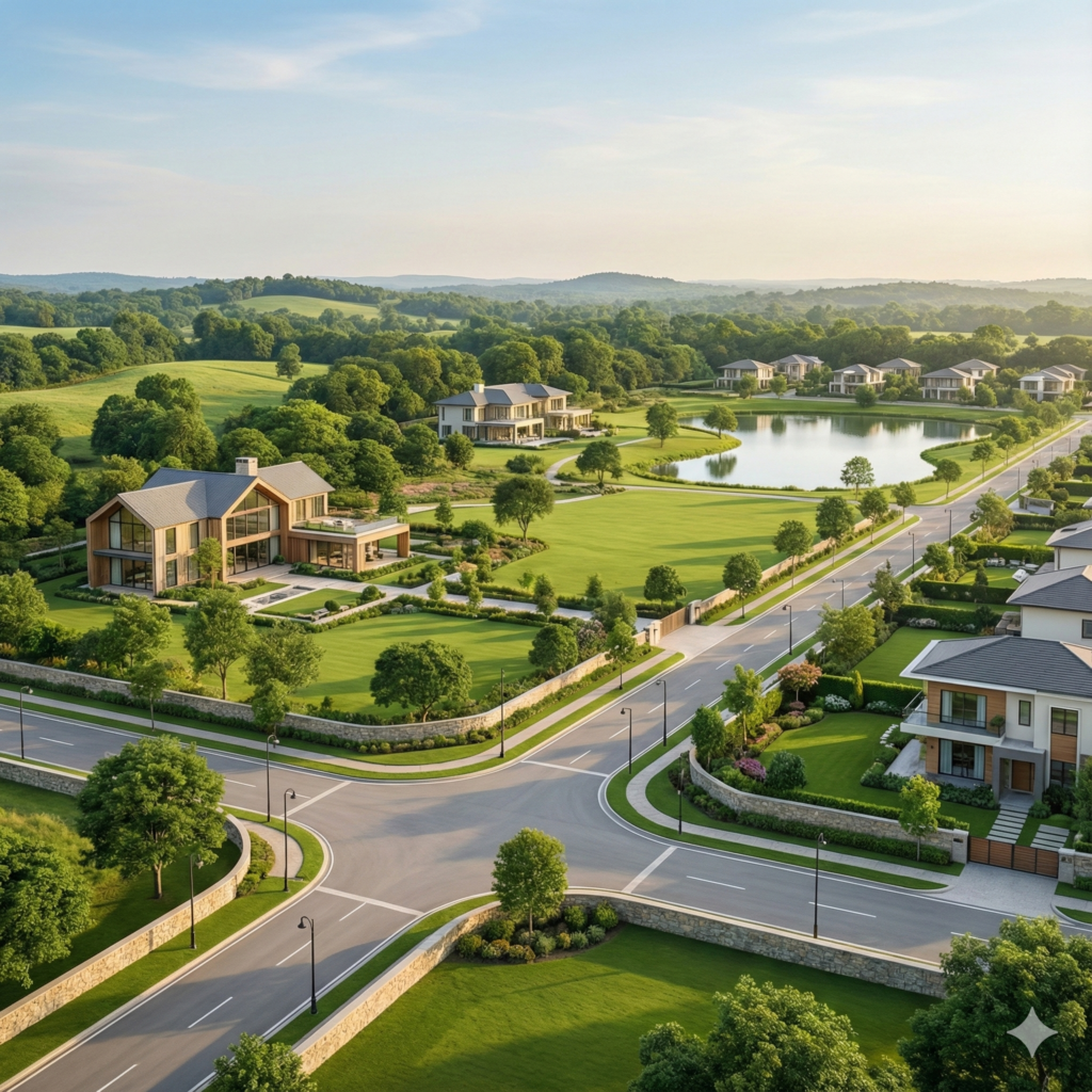 Luxury farmhouse developments surrounded by greenery, designed for peaceful living and future growth.